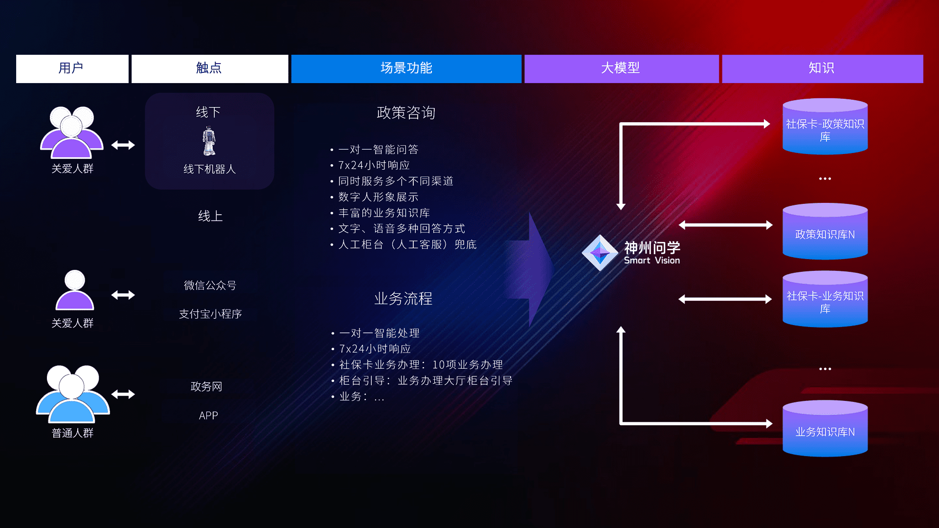 • 线上线下全覆盖:线上提供微信公众号、、、、支付宝小程序、、、、政务网、、、app多种渠道,,,,与线下机器人形成完整服务体系。。。