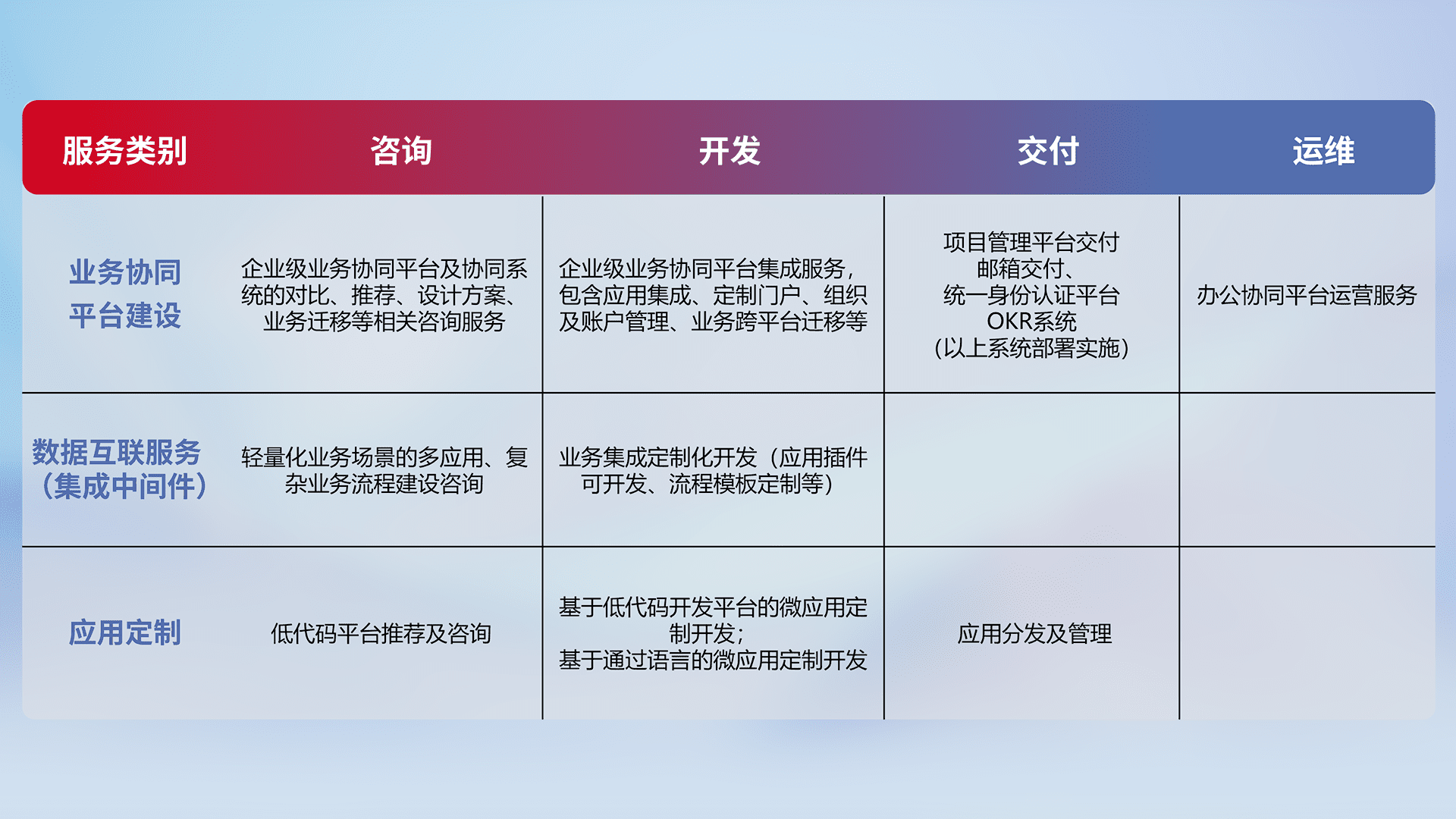 针对钉钉、、、、企微、、、IDaas等平台级产品提供产品的规划、、、、方案、、、交付、、定制化开发等服务,,实现如统一协同办公、、、、智能客户服务、、、混合会议管理、、智能数据查询、、、等业务场景,,,,实现数字化转型。。。。