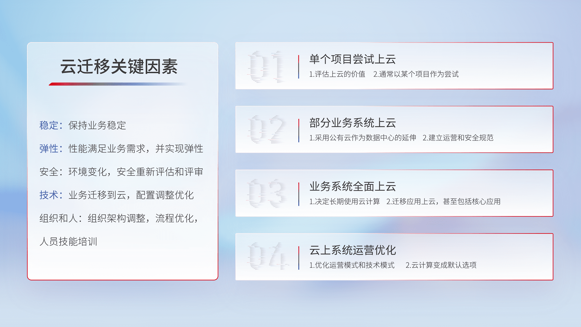 结合实际业务,,,从规划设计、、云平台选型、、、、云原生改造、、、数据迁移、、、、集成交付,,,,迁移全过程为客户识别最佳上云路径,,,做好风险识别管理,,,,设计网络架构、、身份权限、、、安全审计合规、、、操作审计、、日志审计、、、、监控告警策略、、、、多站点容灾设计等,,,,对云上基础设施进行整体规划,,,,提升IT治理水平,,,以满足弹性、、高可用、、高性能的需求。。