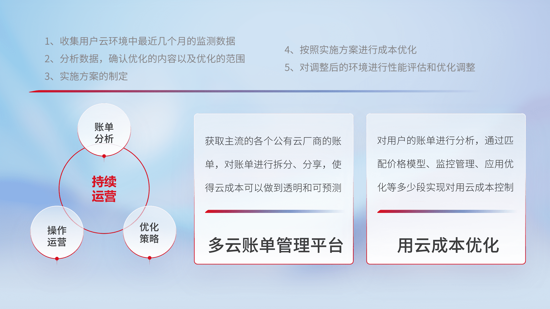 通过多云纳管,,,,以统一的资源数据模型把客户的云资源进行抽象和封装,,进而实现对多云资源的统一操作,,,,保障云资源管理的可靠性、、、稳定性与可用性。。量身定制化运维内容,,配置、、、、开发运维、、、补丁管理、、备份、、、监控、、认证和访问管理、、审计和日常巡检等,,,保障在用云过程中的可靠度,,,,稳定度以及高可用率。。